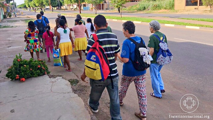 Missionários da Fraternidade – Federação Humanitária Internacional vão pela manhã até a “Feira do Passarão”, local onde estão muitos refugiados da Venezuela na cidade de Boa Vista. De lá, caminham juntos até a igreja e assistem à Missa de domingo.
