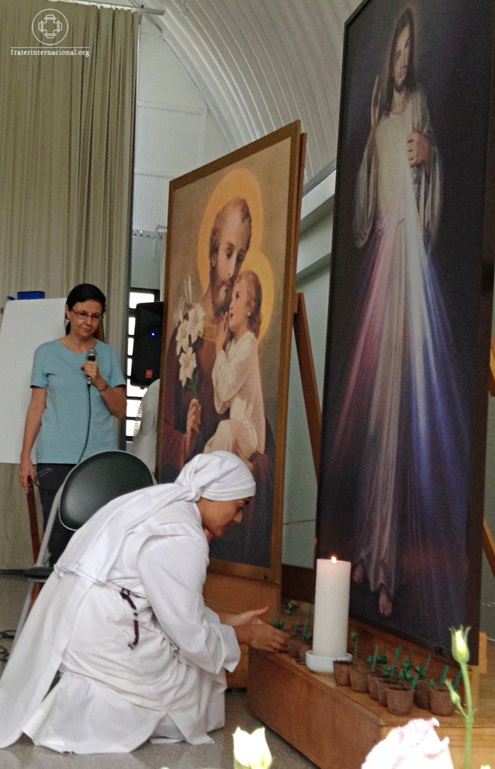 The following day started with the adoration of the Blessed Sacrament and then the meeting was opened by the coordinators of the Planetary Network-of-Light, Nadjana and Amarista. Each participant received a small vase, earth and a seed of a pansy, to symbolize the union and unity among the groups and the task received by all, of being “sowers of love”. Then representatives of the Nucleus-of-Light of the Sacred Heaven shared their experiences. In the afternoon, the Fraternidade, represented by Mirnuk and the Council of Regency, represented by Friar Supremo, presented aspects and goals of the work. In the evening, they followed the transmission of the “sharing” of Trigueirinho and of the Apparition of Mary.