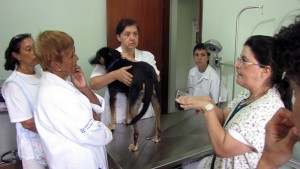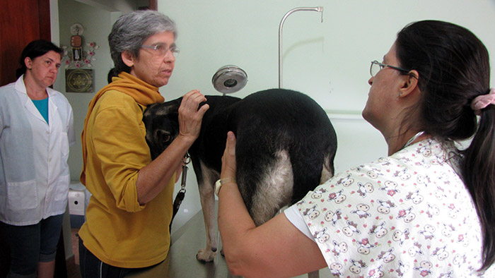 On the treatment table, a medium-sized animal is supported by its caregiver while it is examined by a veterinarian. Surrounding them are caregivers and volunteers of non-governmental organizations (NGO’s) from some cities in the region. The name of this dog is Skipper, one year old, who arrived for care with difficulty in breathing, diahrrea and also some difficulty in lying down. After examining the X-ray, the veterinarian determined that the animal suffered from a diaphragmatic hernia with a loop of the bowel was angled towards the thorax. For this reason, a surgery is decided for the following week at the House of Hope to correct the position of the loops.