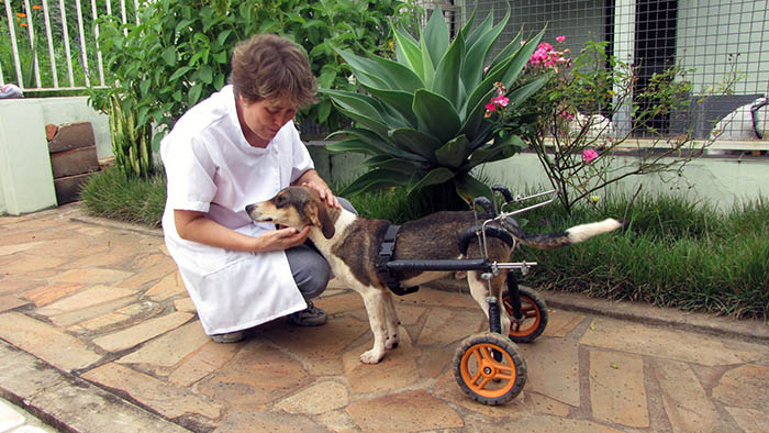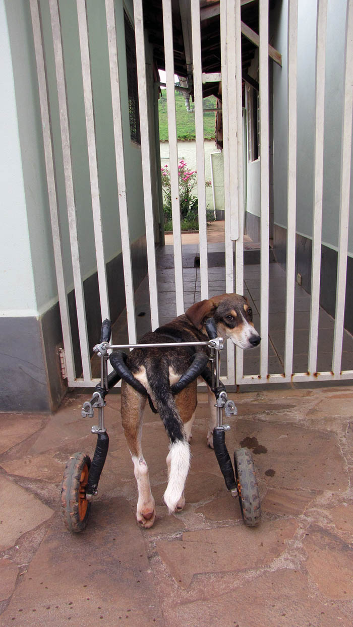 On a wheelchair, the little Tuim arrives to receive acupuncture. Its tutor is Maria José Soares, who takes care of a kennel with more than one hundred animals for the non-governmental organization Amigos dos Animais de Rua (Friends of Street animals) of Cambuquira, a town in the interior of the state of Minas Gerais, Brazil. The treatment with needles is designed to help the recovery of movement of the hind legs, lost after a car injury that took place a fortnight ago, when the wheelchair was required. Tuim still has some sensitivity in this area: is capable of making some slight movements and responds to some stimuli.