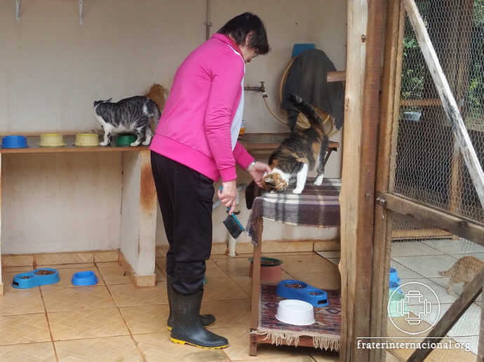 The other group went to the House of Light on the Hill, where they split into four subgroups. One stayed in the headquarters, doing tasks with the gardens. Another went to help in the harmonization of the Park of the Kingdoms. A third subgroup supported the harmonization of the House of Hope (a place of veterinarian services for dogs and cats). A fourth subgroup made home visits to poor families of Carmo da Cachoeira, in the company of nuns of the Grace Mercy Order (the Monastery of the Sacred Charity of Saint Joseph, located in the House of Light on the Hill).