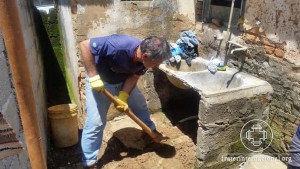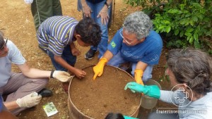 In this environment, the volunteers tried to awaken a little beauty and love for life, cleaning and organizing spaces, renewing colors and creating beds for the cultivation of flowers and greens. Distributed in two fronts of work, one dedicated itself to painting the living-room walls and one of the small rooms, while the other concentrated on the back yard, from where it removed organic residues, plastic and weeds, and built a floor around the little house, to reduce the mud around it.