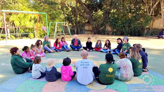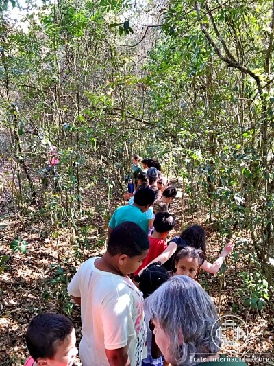 In the afternoon, the activities were conducted with a group of 18 children, who at first formed a wheel of fraternization and introduction. Then all of them went on a walk in the area of the school to the creek, where they made a circular dance and revered the Kingdoms of Nature next to the bamboo tree. Then, they returned to the yard and participated in free activities of spontaneous games, chant and playful game of fitting, ending with a snack.