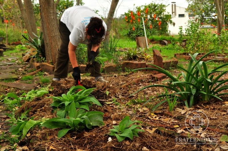 Durante os trabalhos práticos com a terra, os canteiros de rosas no jardim de Maria foram revitalizados com adubação, poda, limpeza e recuperação do solo. O setor de plantas medicinais também recebeu cuidados da equipe.
