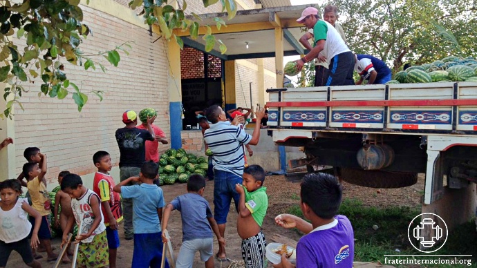 Recepción de muchos alimentos, artículos de higiene y ropas. Un camión con sandías, fruto de la cosecha que tuvo la ayuda de algunos refugiados, descargaron las frutas en el CRI.