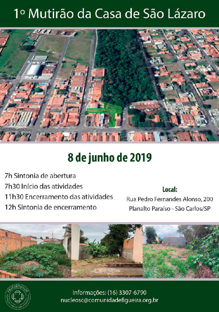 Amanhã, 8 de junho, a população de São Carlos, interior paulista, terá uma grande chance de demonstrar o quanto é solidária. O Núcleo-Luz de Figueira em São Carlos – Imaculada Casa do Alívio do Sofrimento convoca as pessoas, especialmente as residentes no bairro Planalto Paraíso, a participar do Primeiro Mutirão da Casa de São Lázaro, a partir das 7h da manhã.