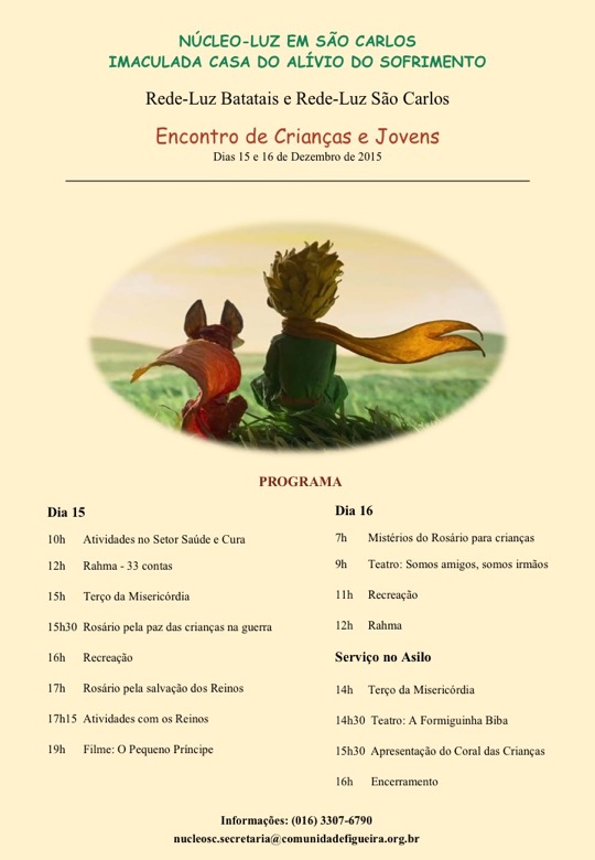 A Rede-Luz de Batatais em parceria com a Rede-Luz de São Carlos, no interior do Estado de São Paulo, Brasil, realiza nos dias 15 e 16 de dezembro, no Núcleo-Luz de São Carlos, o Encontro de Crianças e Jovens.