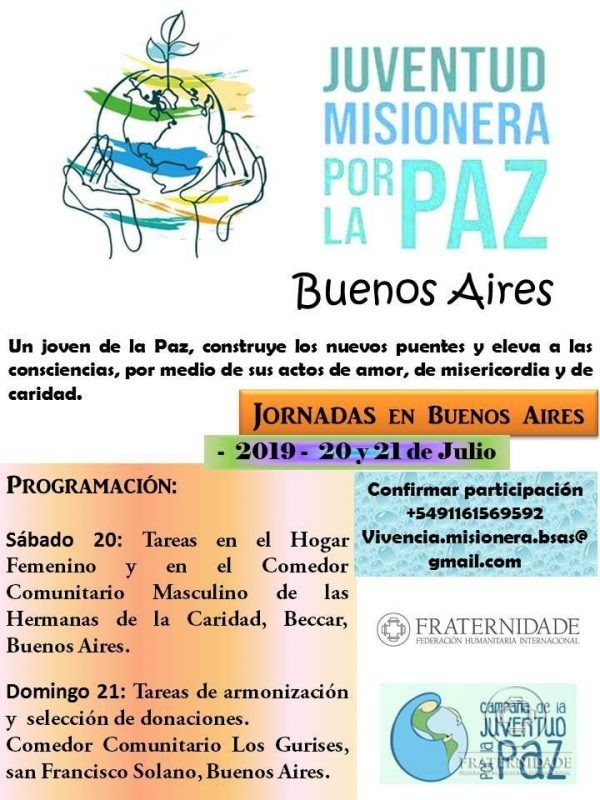 No próximo final de semana haverá Vivência Missionária em Buenos Aires. O grupo da Rede-Luz Buenos Aires e a “Juventude Missionária pela Paz” participarão da Vivência Missionária, na capital argentina, no próximo final de semana, dias 20 e 21 de julho. Dentre as diversas atividades previstas, no sábado (20) aproximadamente 12 pessoas irão ao Lar Feminino das Irmãs Missionárias da Caridade, localizado em Beccar, zona norte da Grande Buenos Aires. Ali, o grupo se desdobrará em três frentes de serviço.
